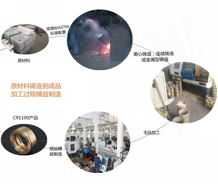 本產(chǎn)品實行ASTM標(biāo)準(zhǔn)………………………………………………… 根據(jù)客戶產(chǎn)品需求我們提供的鑄造方式有:離心鑄造,連續(xù)鑄造和金屬型鑄造。…………………………………………………………… 牌號C91100合金銅化學(xué)成分:Cu82-85 Sn15-17 Pb0.25 Zn0.25 Fe0.25 Al0.005 Si0.005 Ni0.5 Sb0.2 P1 S0.05