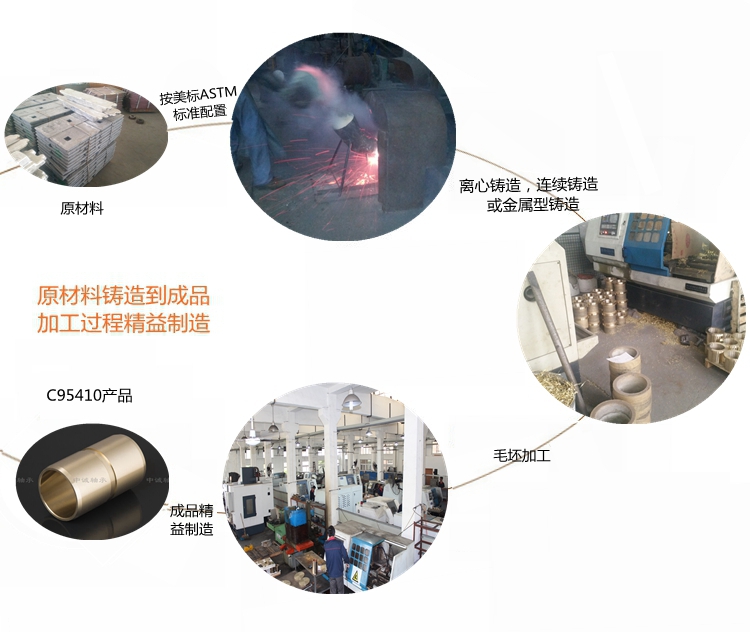 本產(chǎn)品實(shí)行ASTM標(biāo)準(zhǔn)………………………………………………… 根據(jù)客戶產(chǎn)品需求我們提供的鑄造方式有:離心鑄造,連續(xù)鑄造和金屬型鑄造?!?牌號(hào)C95410合金銅化學(xué)成分:Cu≥83 Fe3-5 Al10-11.5 Mn0.5 Ni1.5-2.5